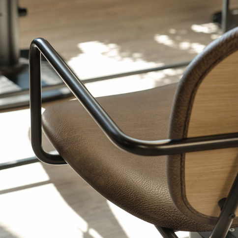 Broadway-stolen förenar en stark järnstomme med en svängd träsits klädd i tyg – en kontrastrik och balanserad kombination som ger både visuell styrka och utmärkt sittkomfort. Baksidan av ryggstödet har en träeffektfinish som adderar värme och textur till den annars industriella helheten.