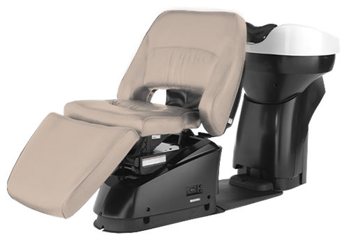 Stolen är ergonomiskt utformad med dubbla gel-fyllda nackkuddar och huvudkuddar, samt en keramisk tvättskål som ger både komfort och hållbarhet. Rörelserna är helt motoriserade och kan styras enkelt via fotkontroll, vilket ger smidig och exakt justering utan att avbryta behandlingen.